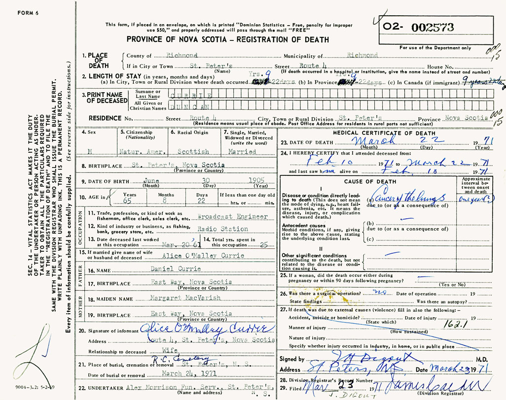 PROVINCE OF NOVA SCOTIA — REGISTRATION OF DEATH