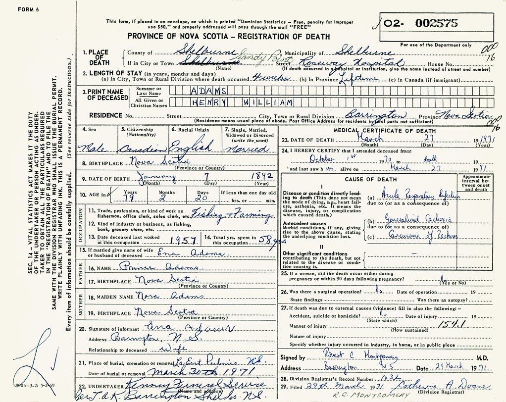 PROVINCE OF NOVA SCOTIA — REGISTRATION OF DEATH