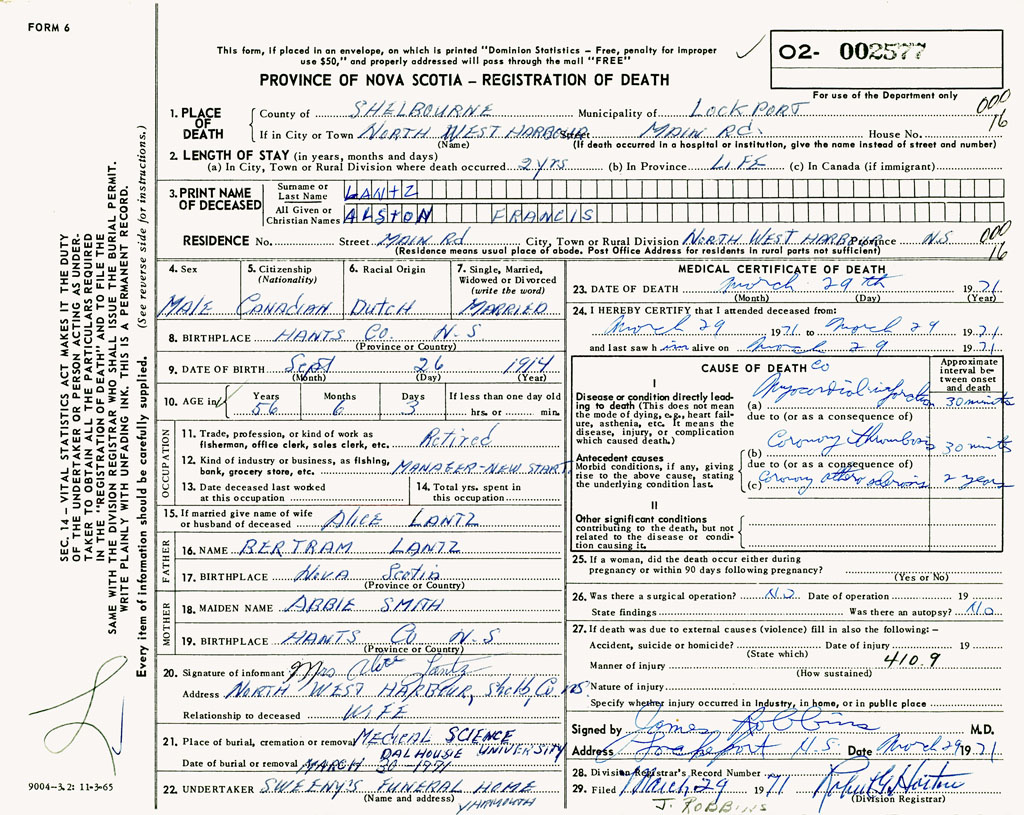 PROVINCE OF NOVA SCOTIA — REGISTRATION OF DEATH