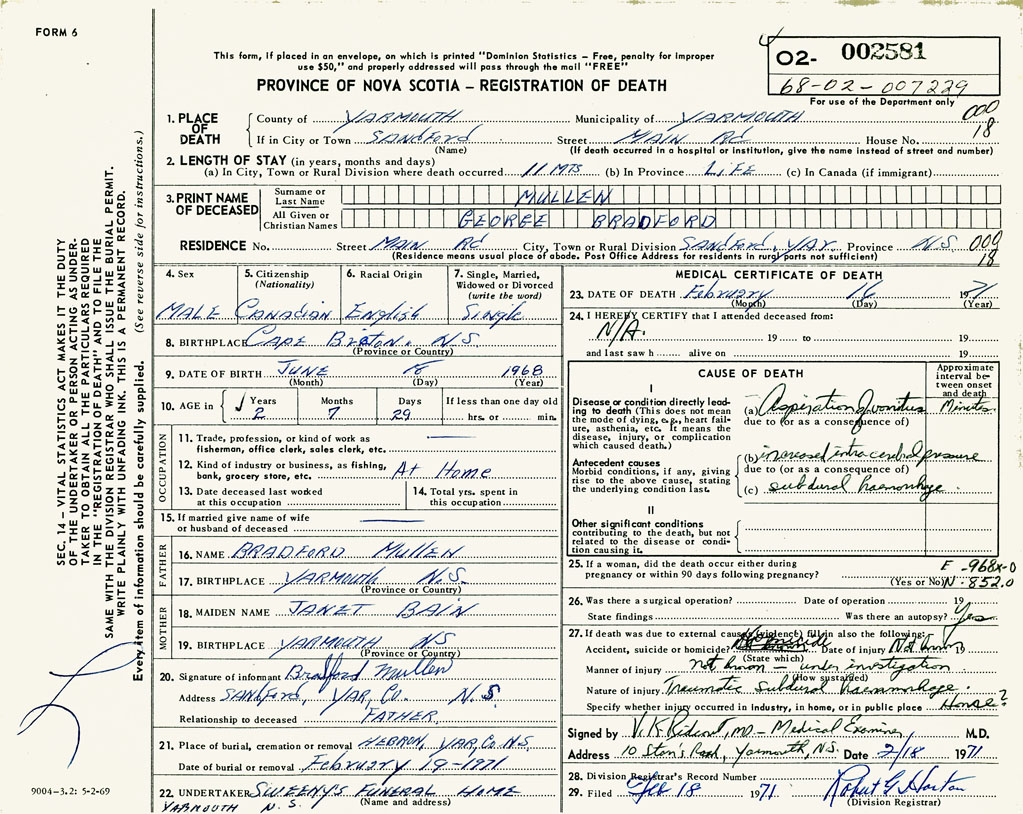 PROVINCE OF NOVA SCOTIA — REGISTRATION OF DEATH