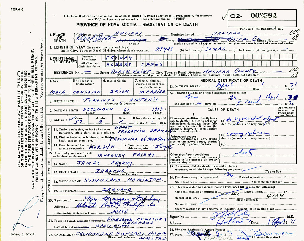 PROVINCE OF NOVA SCOTIA — REGISTRATION OF DEATH