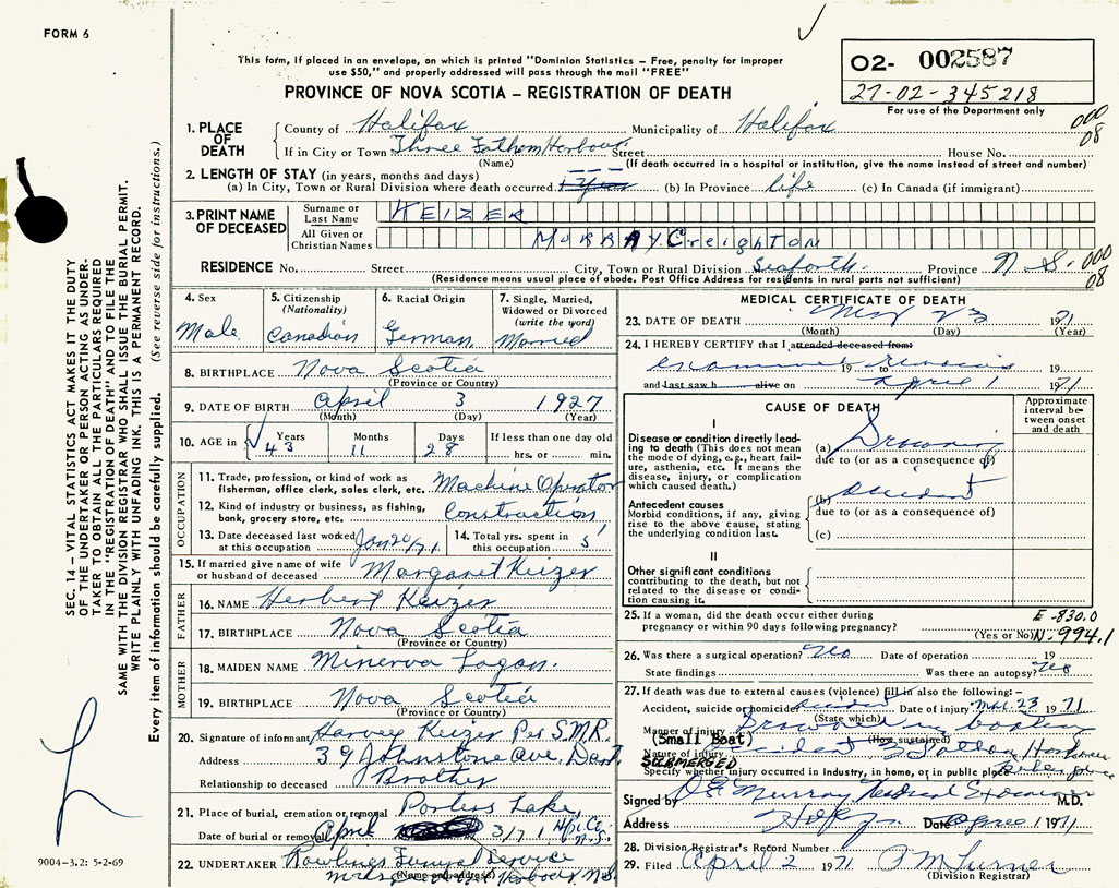 PROVINCE OF NOVA SCOTIA — REGISTRATION OF DEATH