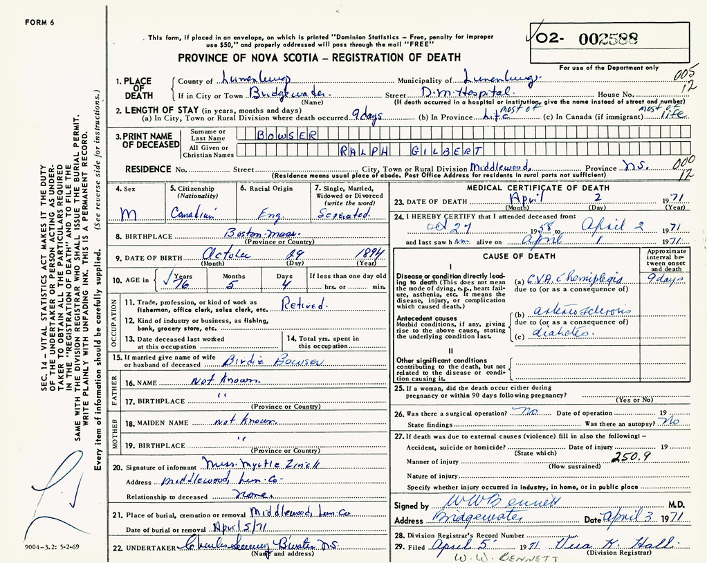 22. Undertaker Charles Sweeney, Bridgewater, NS