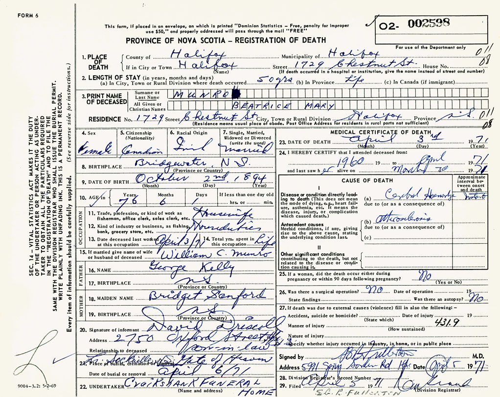 If death occured in a hospital or institution 1729 Chestnut St., Halifax, NS
