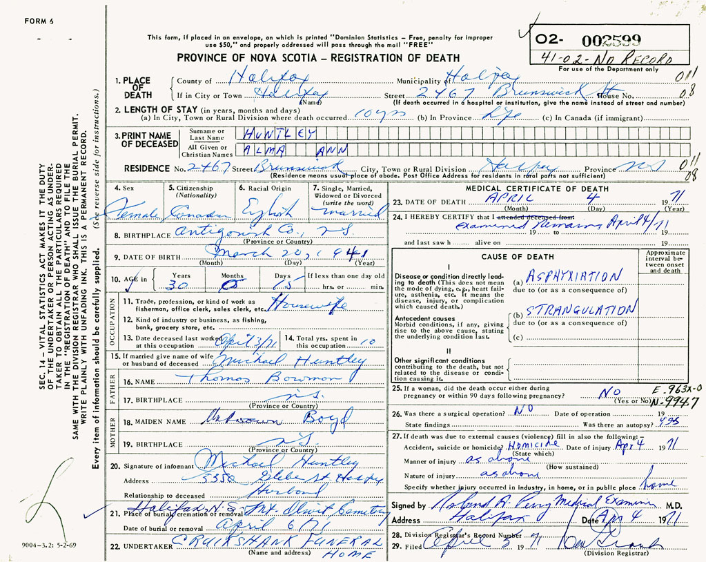 If death occured in a hospital or institution 2467 Brunswick St, Halifax, NS