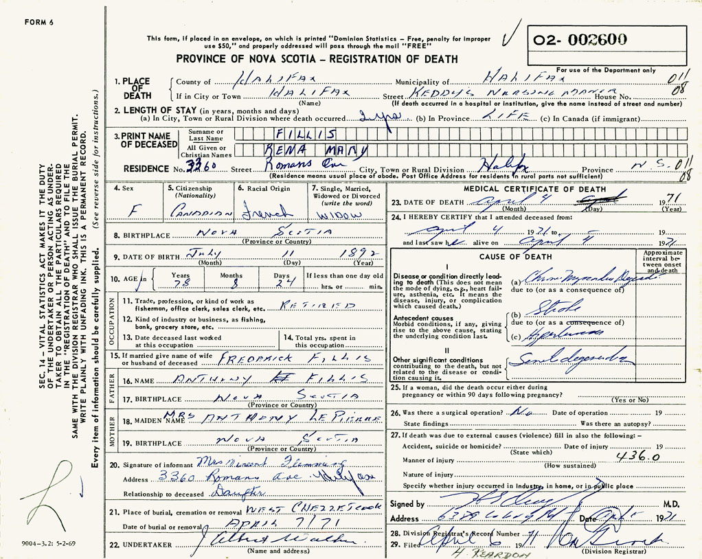 PROVINCE OF NOVA SCOTIA — REGISTRATION OF DEATH