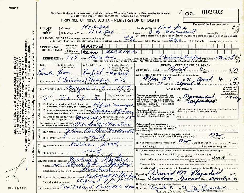 PROVINCE OF NOVA SCOTIA — REGISTRATION OF DEATH
