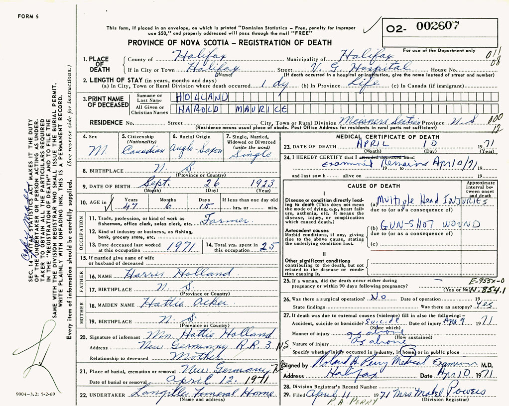 PROVINCE OF NOVA SCOTIA — REGISTRATION OF DEATH