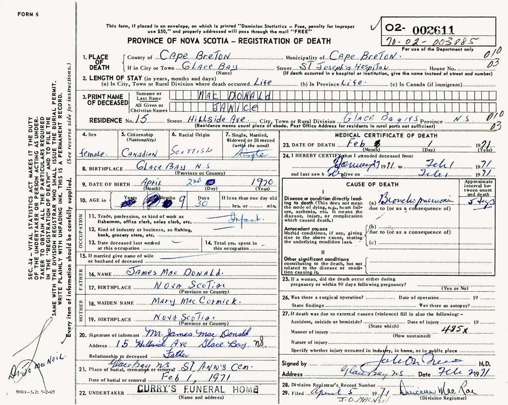 1. PLACE OF DEATH County of Cape Breton If in City or Town Glace Bay