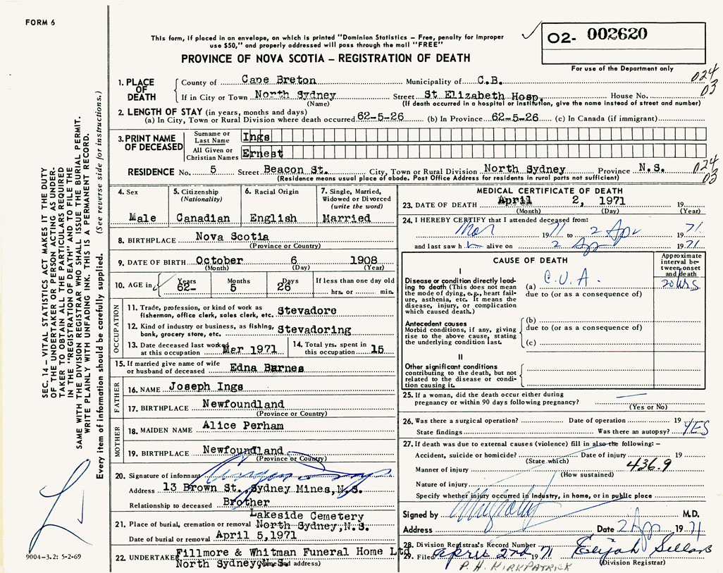 PROVINCE OF NOVA SCOTIA — REGISTRATION OF DEATH