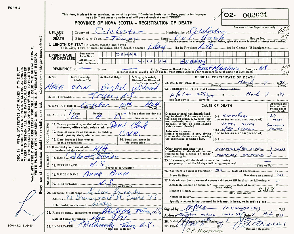PROVINCE OF NOVA SCOTIA — REGISTRATION OF DEATH