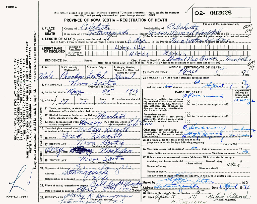 PROVINCE OF NOVA SCOTIA — REGISTRATION OF DEATH