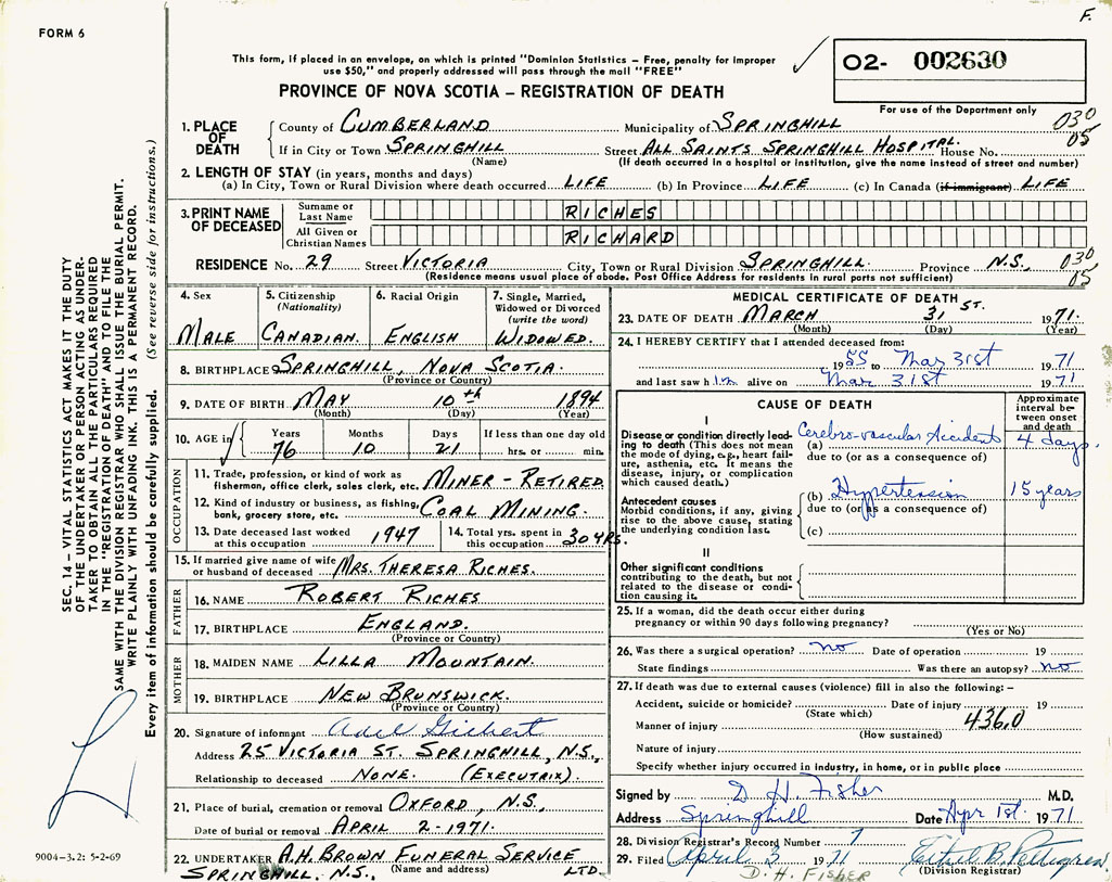 PROVINCE OF NOVA SCOTIA — REGISTRATION OF DEATH