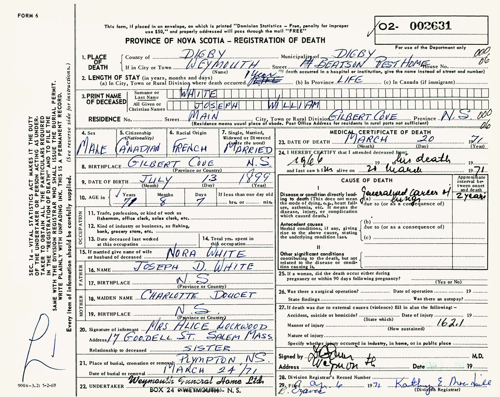 1. PLACE OF DEATH County of Digby If in City or Town Weymouth