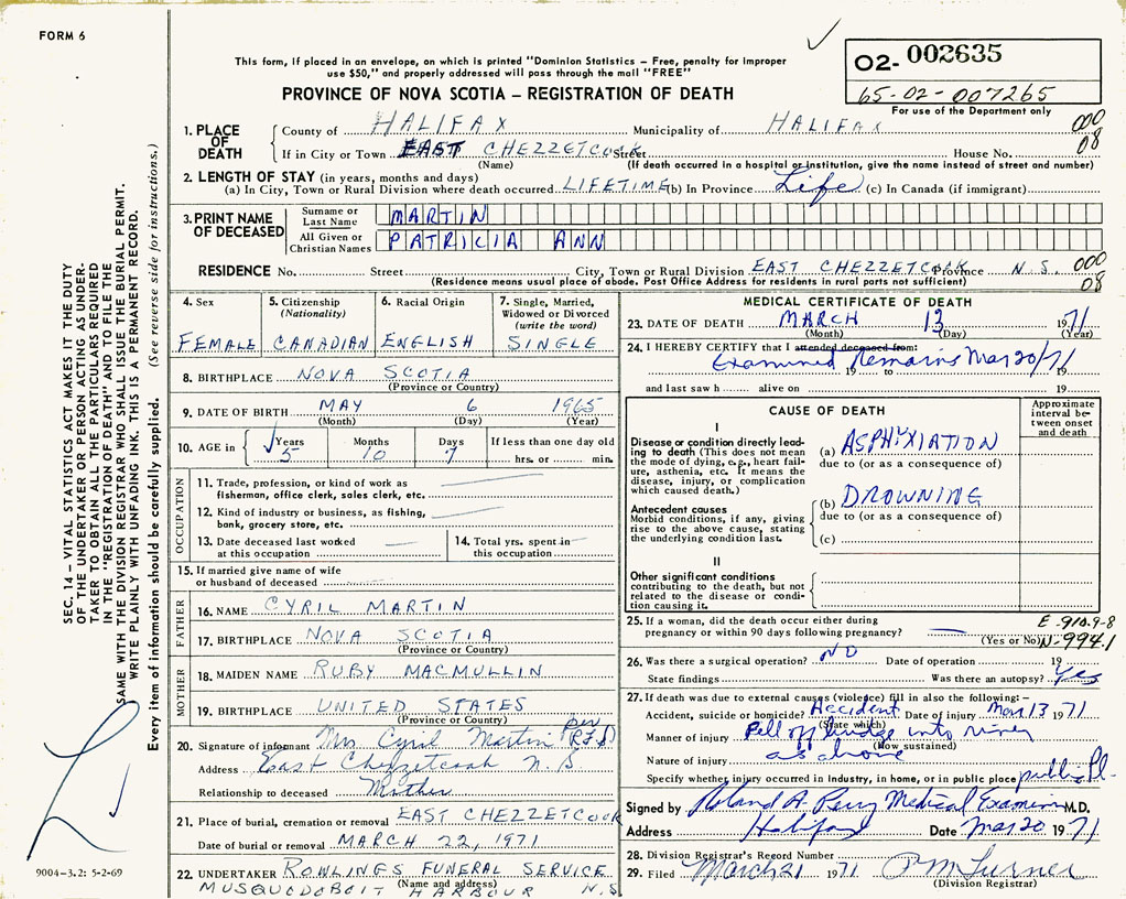 1. PLACE OF DEATH County of Halifax If in City or Town East Chezzetcook