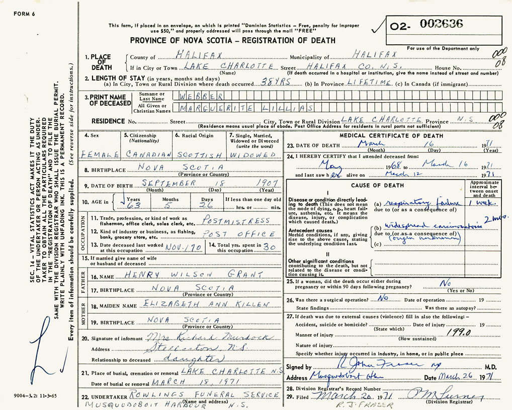 PROVINCE OF NOVA SCOTIA — REGISTRATION OF DEATH