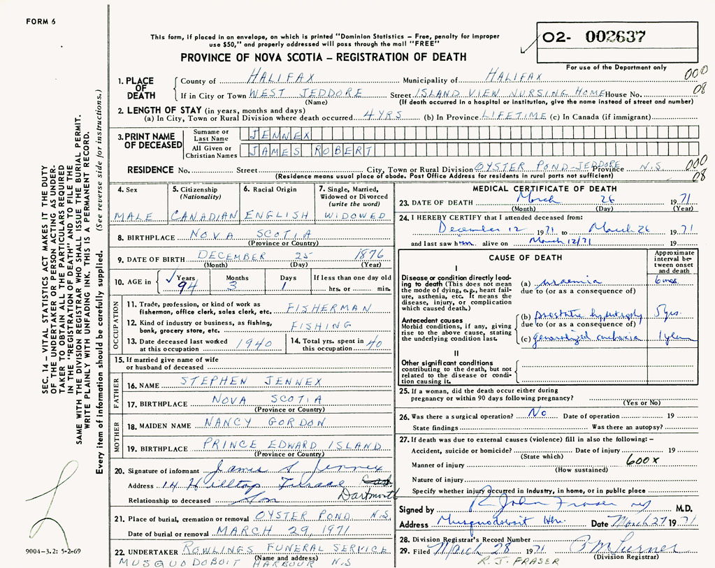 PROVINCE OF NOVA SCOTIA — REGISTRATION OF DEATH