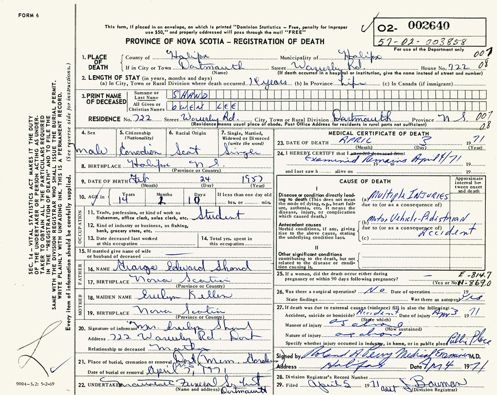 PROVINCE OF NOVA SCOTIA — REGISTRATION OF DEATH
