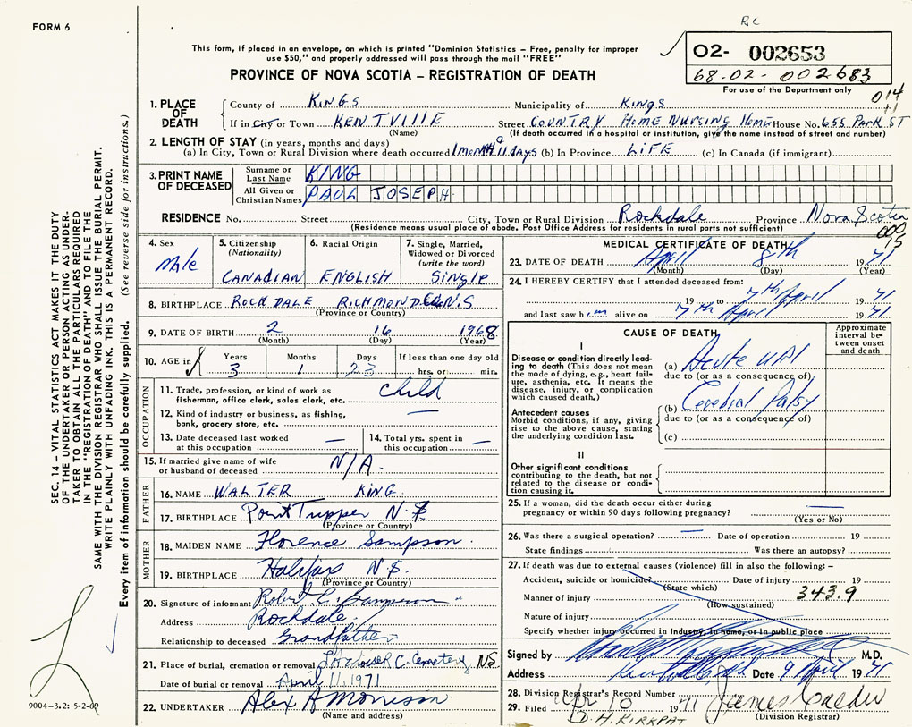 1. PLACE OF DEATH County of Kings If in City or Town Kentville