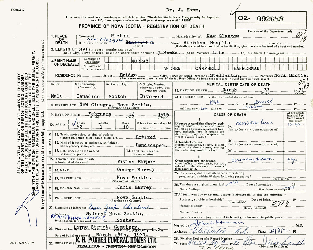 PROVINCE OF NOVA SCOTIA — REGISTRATION OF DEATH