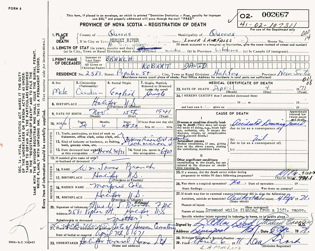 PROVINCE OF NOVA SCOTIA — REGISTRATION OF DEATH