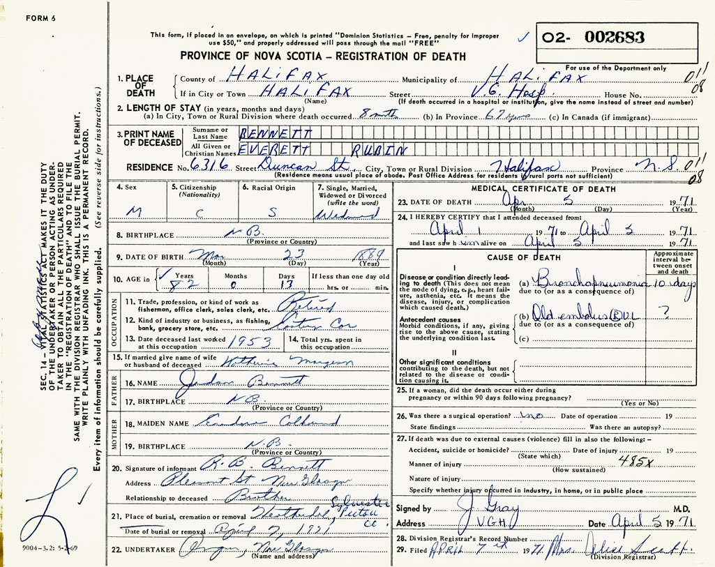 PROVINCE OF NOVA SCOTIA — REGISTRATION OF DEATH