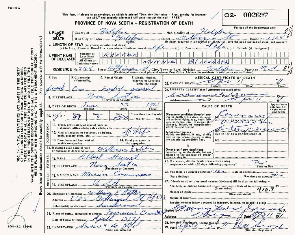 PROVINCE OF NOVA SCOTIA — REGISTRATION OF DEATH