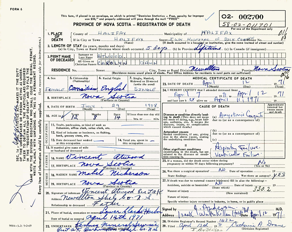 PROVINCE OF NOVA SCOTIA — REGISTRATION OF DEATH