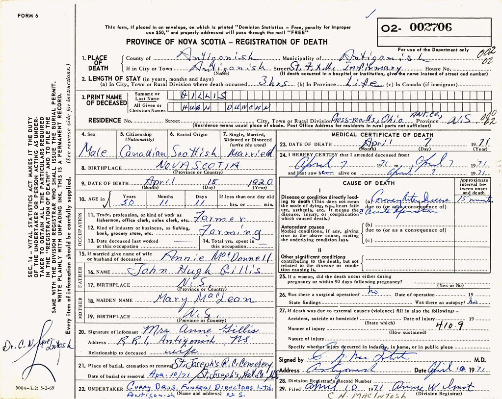 1. PLACE OF DEATH County of Antigonish If in City or Town Antigonish