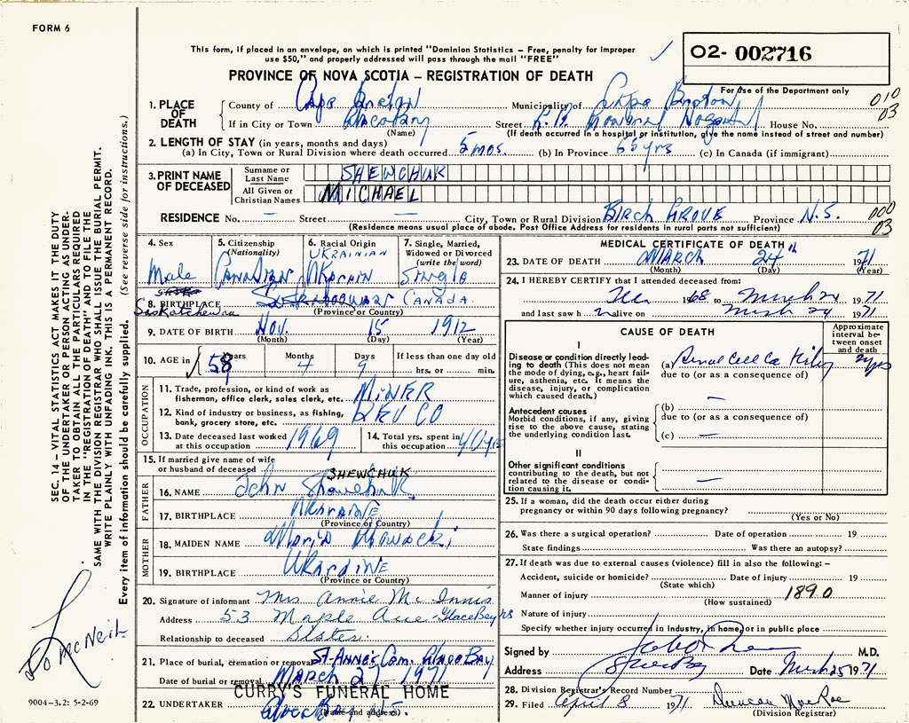 1. PLACE OF DEATH County of Cape Breton If in City or Town Glace Bay