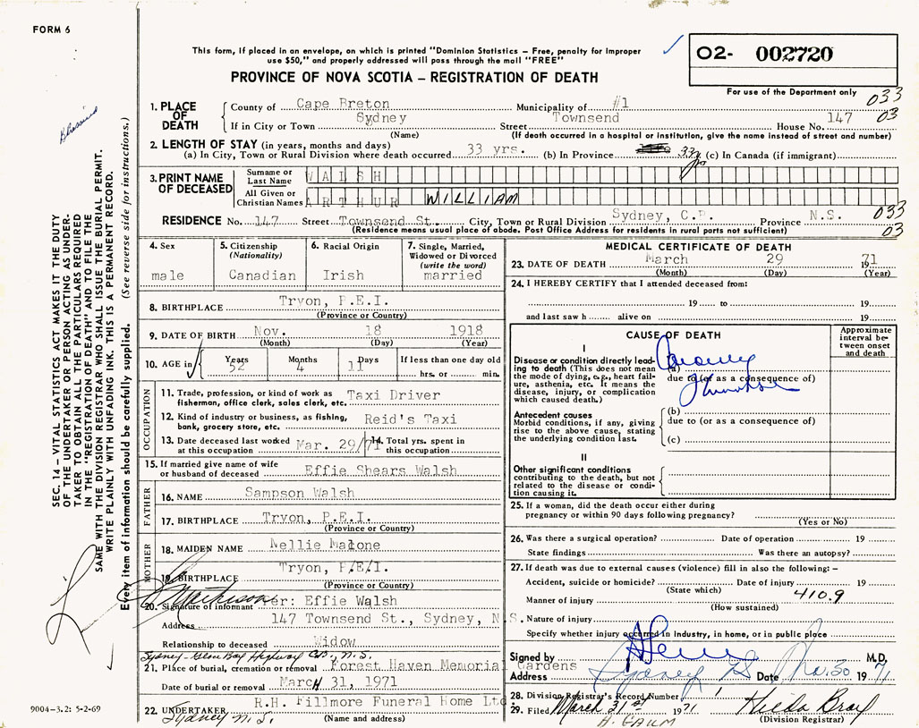 PROVINCE OF NOVA SCOTIA — REGISTRATION OF DEATH