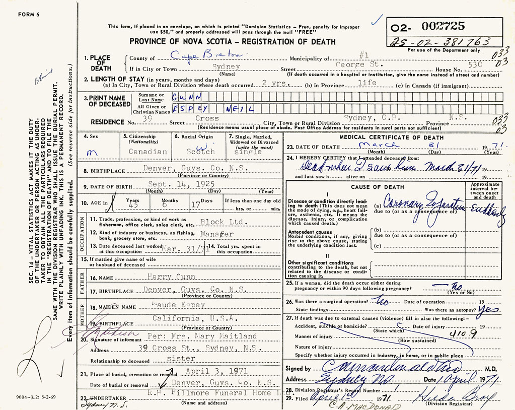 PROVINCE OF NOVA SCOTIA — REGISTRATION OF DEATH