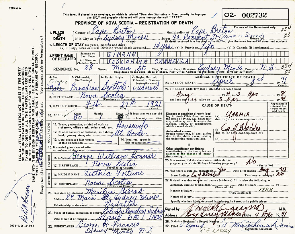 PROVINCE OF NOVA SCOTIA — REGISTRATION OF DEATH