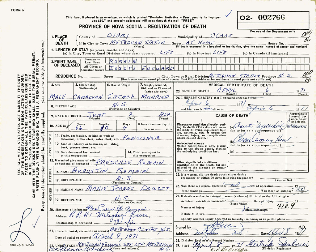 PROVINCE OF NOVA SCOTIA — REGISTRATION OF DEATH