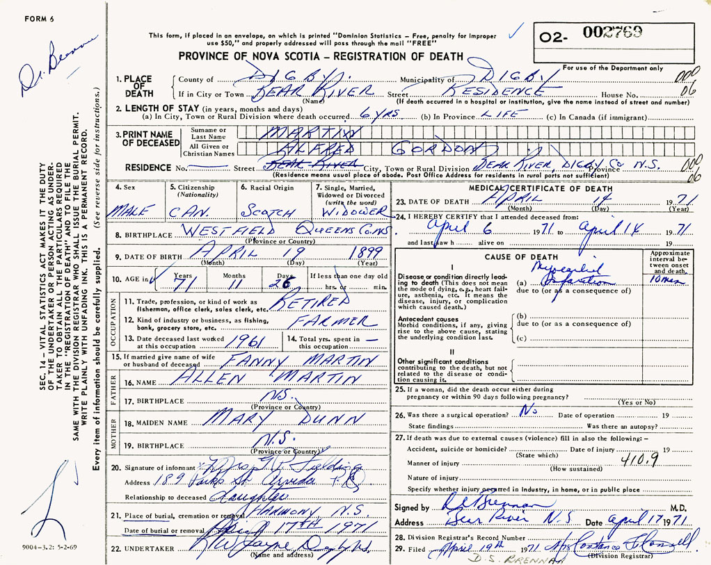 PROVINCE OF NOVA SCOTIA — REGISTRATION OF DEATH