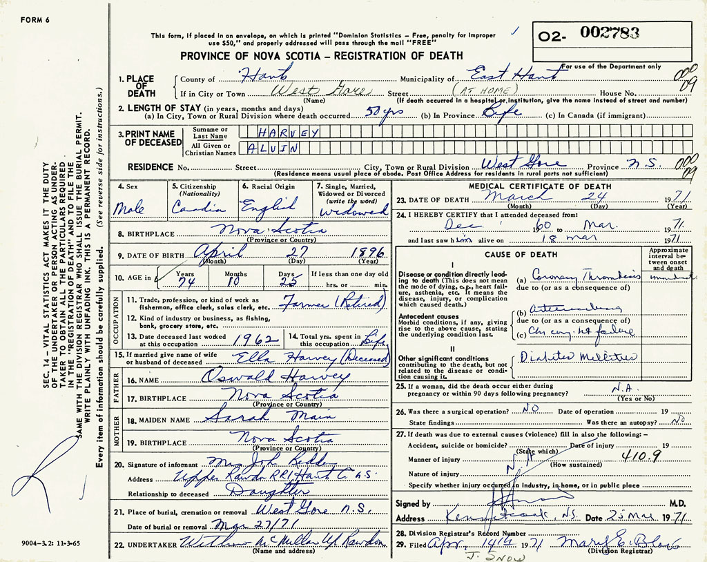 PROVINCE OF NOVA SCOTIA — REGISTRATION OF DEATH