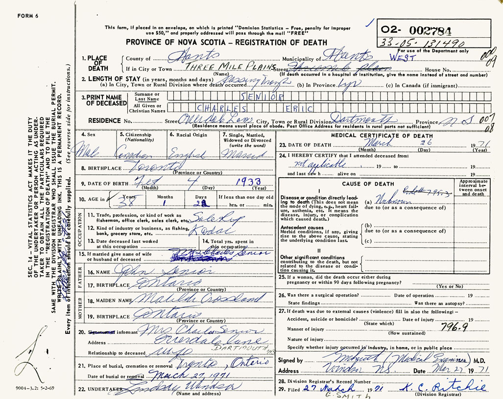 PROVINCE OF NOVA SCOTIA — REGISTRATION OF DEATH