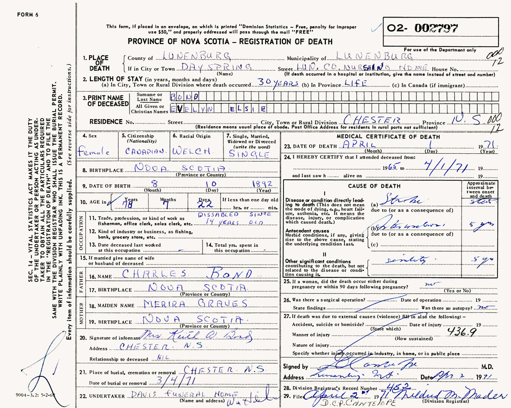 PROVINCE OF NOVA SCOTIA — REGISTRATION OF DEATH