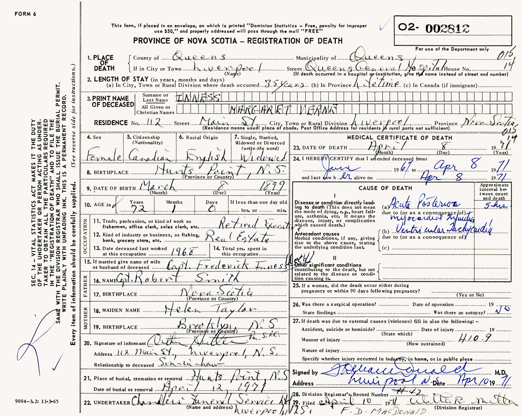 PROVINCE OF NOVA SCOTIA — REGISTRATION OF DEATH