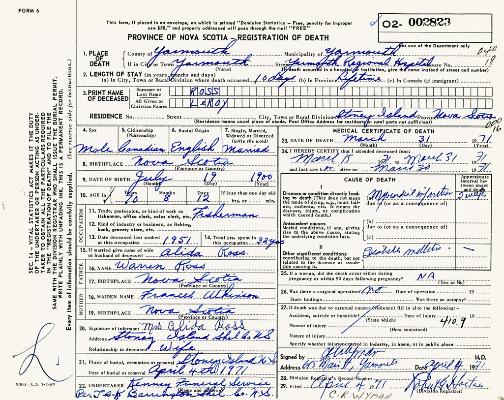 PROVINCE OF NOVA SCOTIA — REGISTRATION OF DEATH