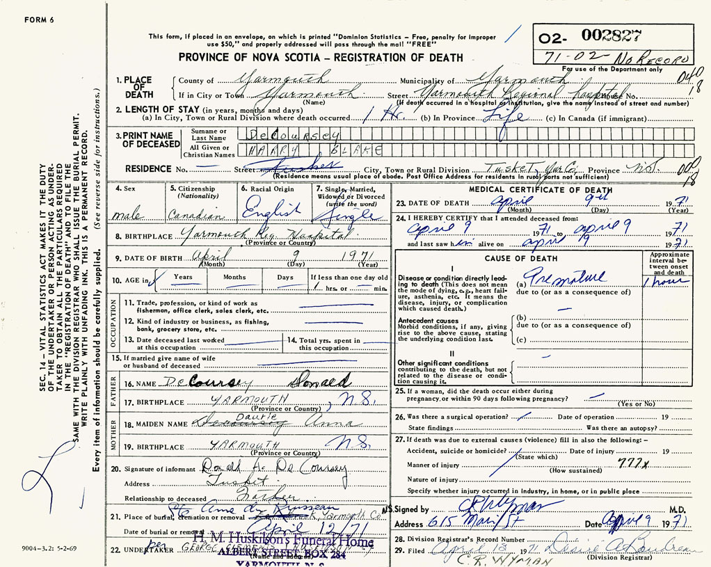 PROVINCE OF NOVA SCOTIA — REGISTRATION OF DEATH
