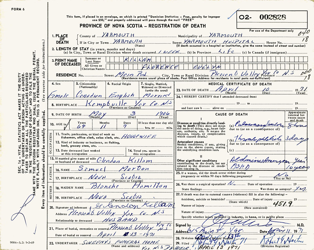 PROVINCE OF NOVA SCOTIA — REGISTRATION OF DEATH
