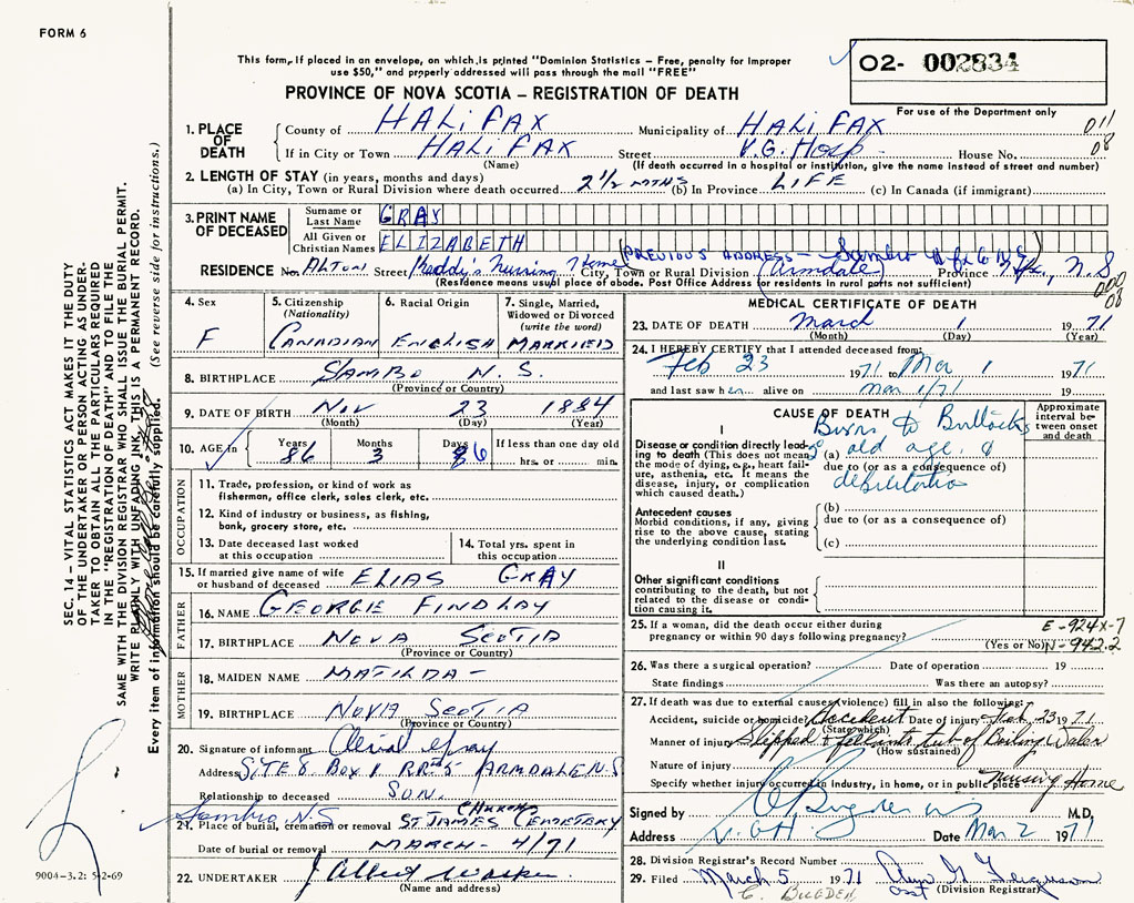 PROVINCE OF NOVA SCOTIA — REGISTRATION OF DEATH