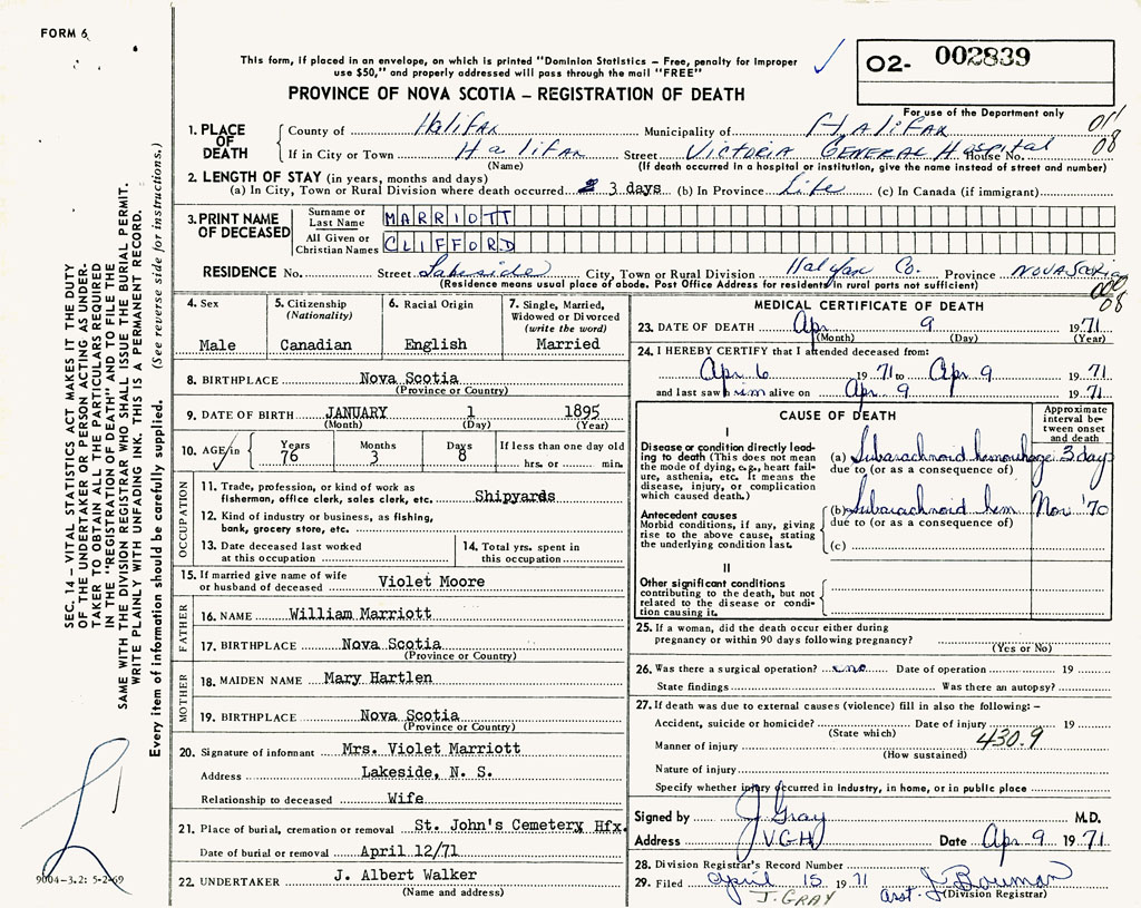 PROVINCE OF NOVA SCOTIA — REGISTRATION OF DEATH