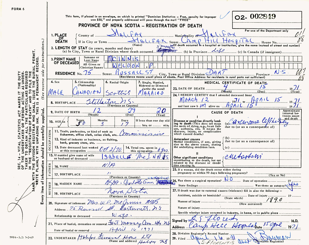 PROVINCE OF NOVA SCOTIA — REGISTRATION OF DEATH