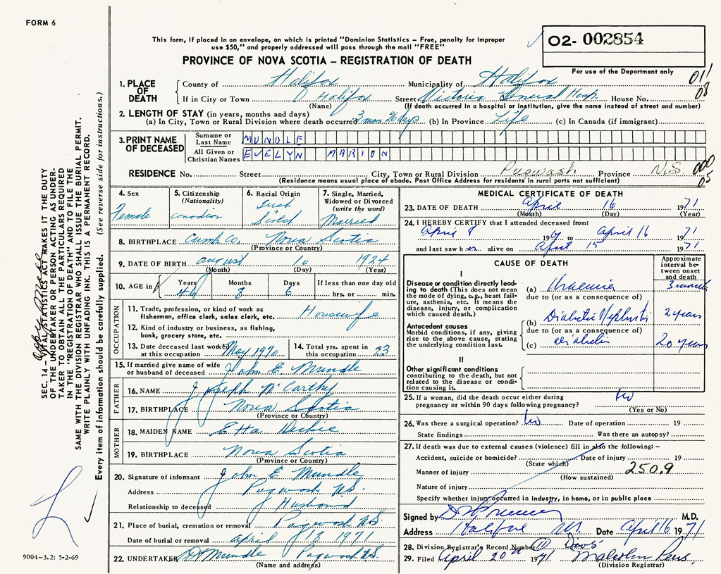 PROVINCE OF NOVA SCOTIA — REGISTRATION OF DEATH