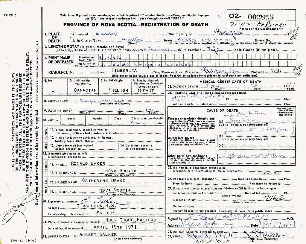 PROVINCE OF NOVA SCOTIA — REGISTRATION OF DEATH
