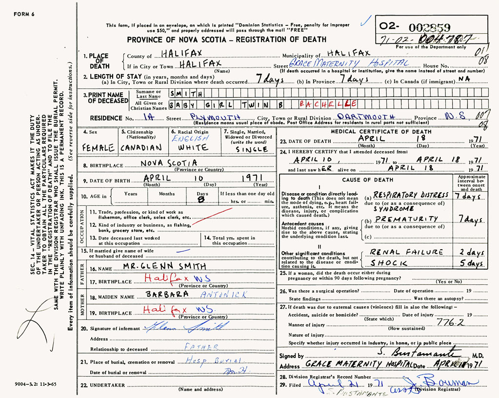 PROVINCE OF NOVA SCOTIA — REGISTRATION OF DEATH