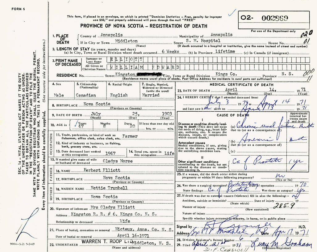 PROVINCE OF NOVA SCOTIA — REGISTRATION OF DEATH