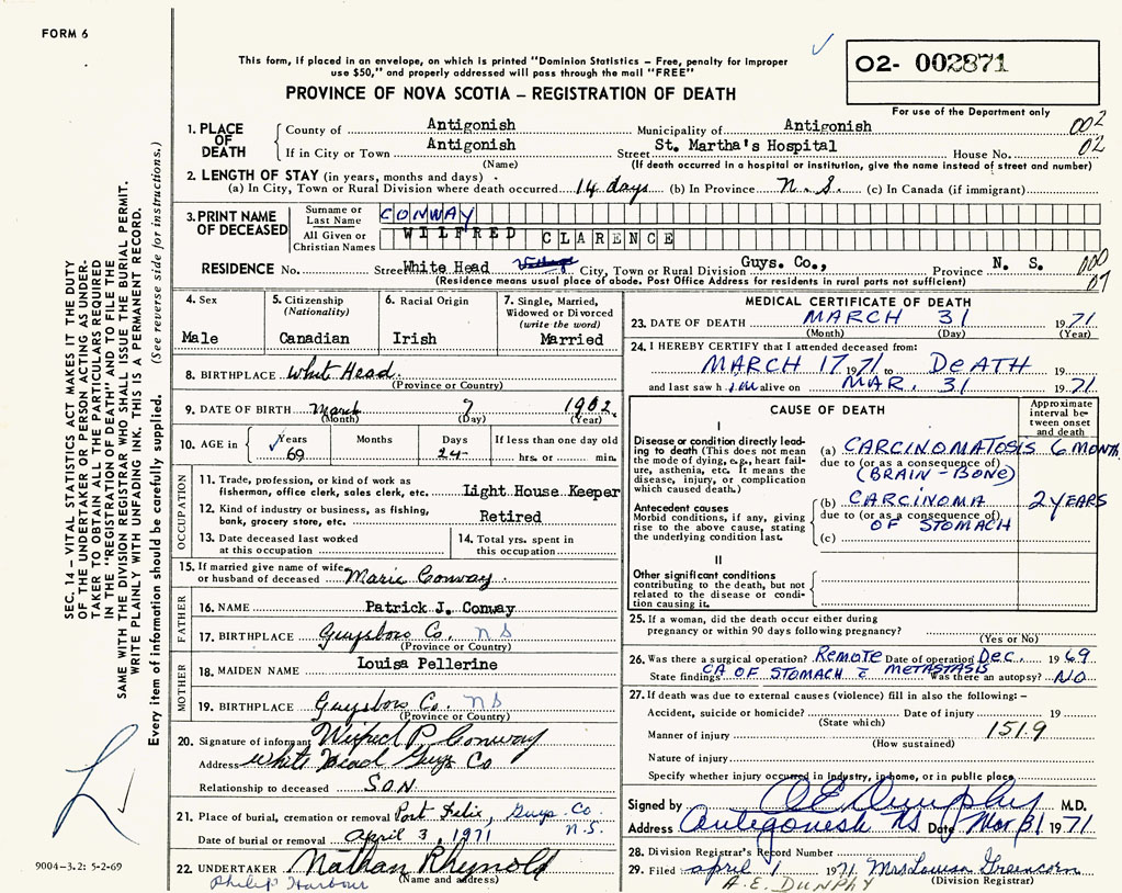 1. PLACE OF DEATH County of Antigonish If in City or Town Antigonish